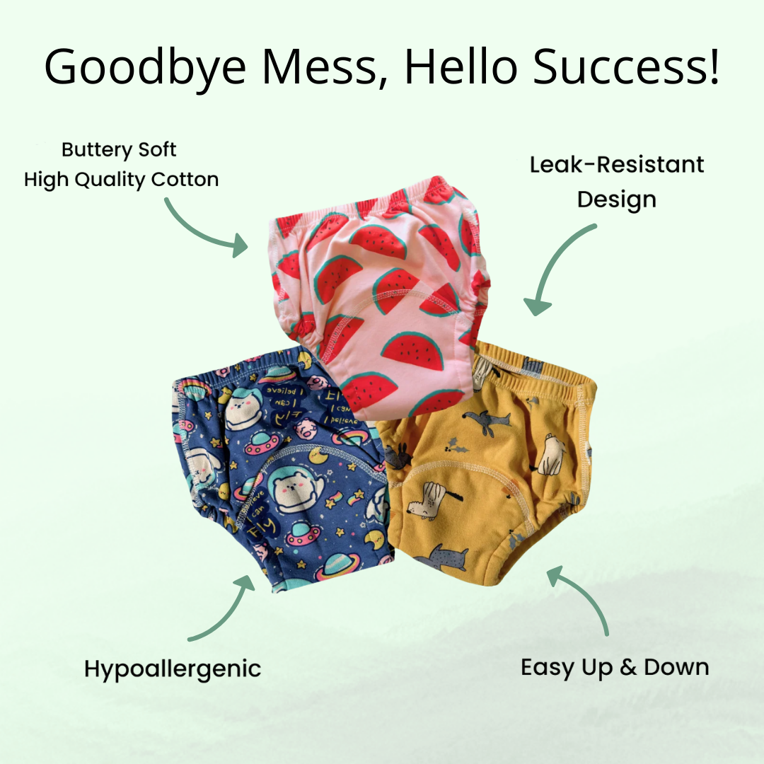 Going straight from diapers to underwear often causes setbacks. PottyPants™ bridge the gap: soft like real underwear, absorbent enough for accidents, and reusable — helping your child succeed faster.